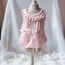 Crafted with intricate floral lace and a gently volumed silhouette, this piece creates a refined and charming look that feels both timeless and feminine. The ruffled neckline and ribbon details at the waist add a graceful finishing touch.